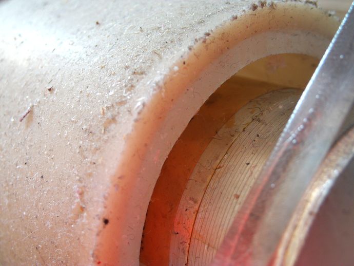 The wheel and tire assembly was then broken out of the mold by cutting away the outer mold tubing on two sides, breaking the tube along one of the cuts, and folding the tube along the other cut. Think opening up a wrist shackle.