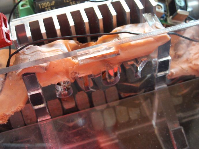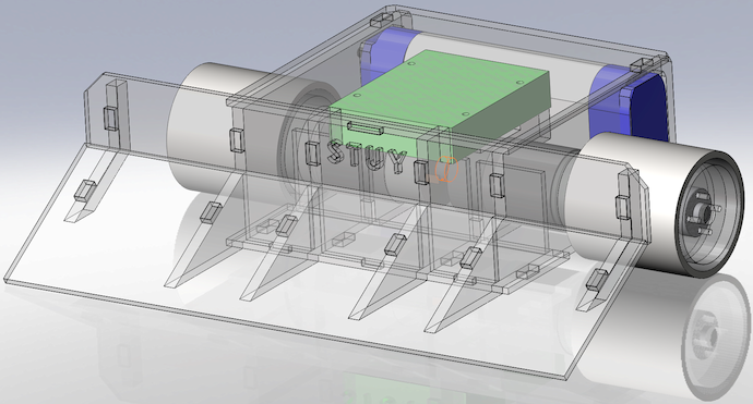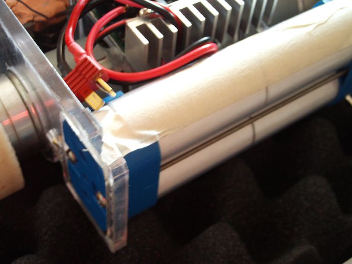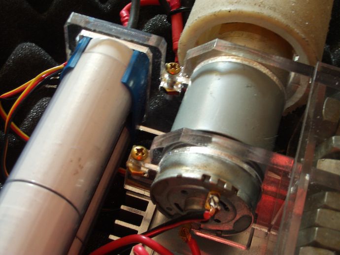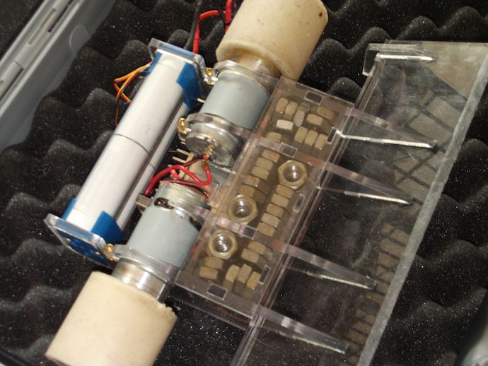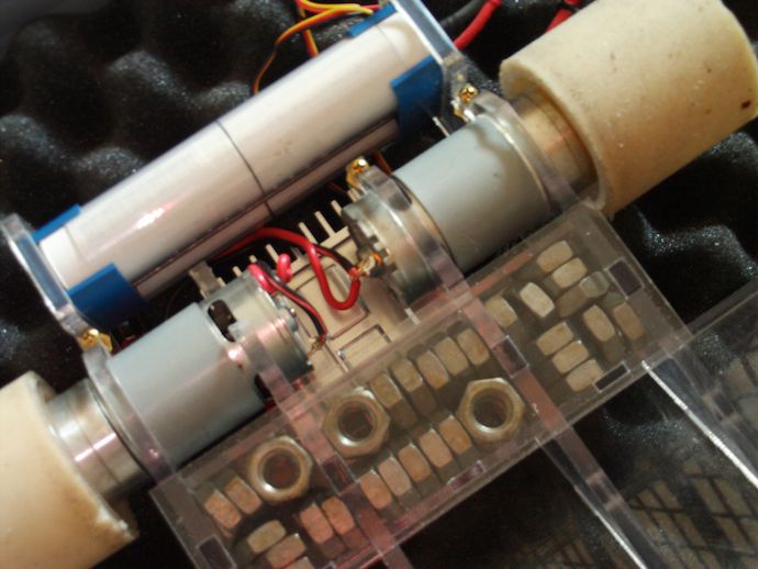 Pursuing the goal of robustness and simplicity, Harpy features no flat horizontal load-bearing structures in its chassis. That is, contrary to most “standard” robot designs, there is no “base plate” or platform on which other components are mounted. Instead, Harpy has four one-quarter inch PETG plates standing vertically. They clamp onto the motors and clip onto the ends of the battery pack. In this way, the sturdy gearmotors and “shotgun barrel” style A123 pack (built from kit from the now-defunct Model Electronics Corp.) serve as the primary structural elements of the chassis.