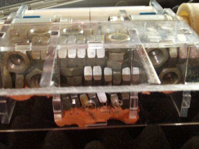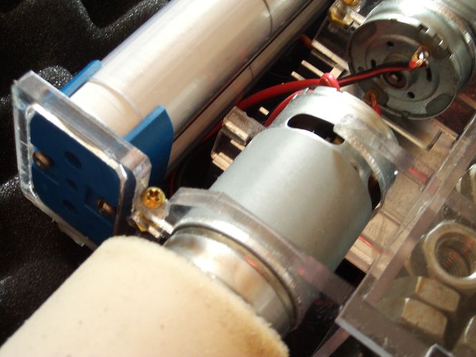 Harpy has immense pushing power, due to its 550-size gearmotors and custom-molded wheels. Thanks to cylindrical gearheads over the gearmotors that are flush and inline to the motor cans, Harpy has wheels that fit over the gearhead casing, rather than protruding out from the side of the gearmotors. The wheel forms are made from polycarbonate tubing (razor-sawed by hand) with inserts laser-cut from PETG. They are then placed inside a mold of similar construction. Pathway Polymers Por-A-Mold S-111 (which has a cured hardness of Shore A 20) was then mixed and poured into the mold.