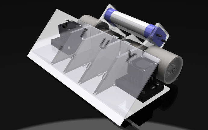 Harpy’s weight distribution (which is to place a maximal amount of weight upon tires and to minimize weight on ground contact points that do not contribute to pushing force) was heavily considered during design, but it was not a major design goal. Simplicity and robustness of the chassis were seen as more important and could not be compromised by design choices that improved weight distribution. Thus, a four-wheel design (driven by belts or gears from the two motors) was rejected, as well as a scoop with adjustable “ride height.”