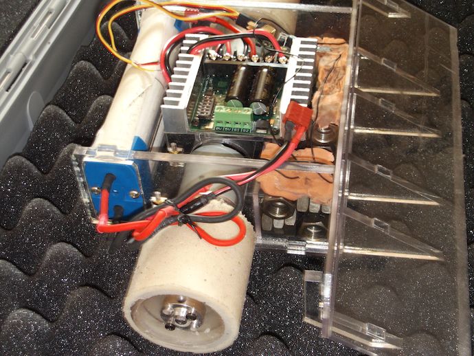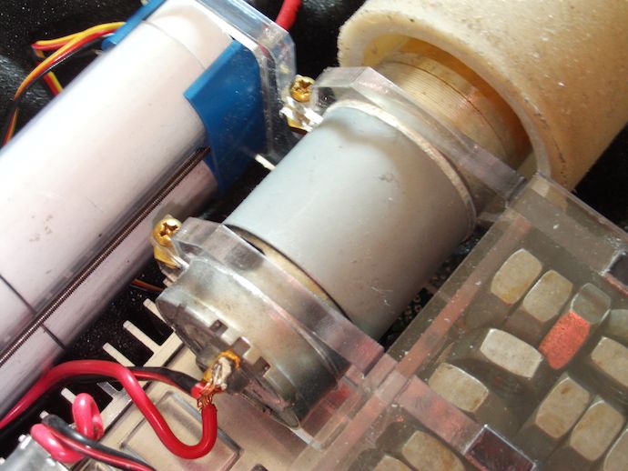 Harpy’s drivetrain uses the motors that were used in La Cucaracha, only paired with larger, stickier wheels. It also has more capable, robust 4-cell 2.3Ah A123 lithium-iron-phosphate batteries capable of 70A continuous, but has a motor controller (Dimension Engineering Sabertooth 2×25A) that is akin to complete crap.