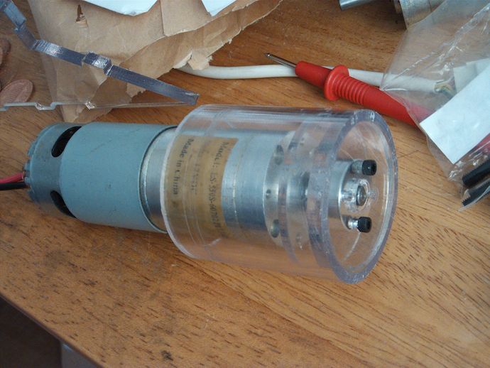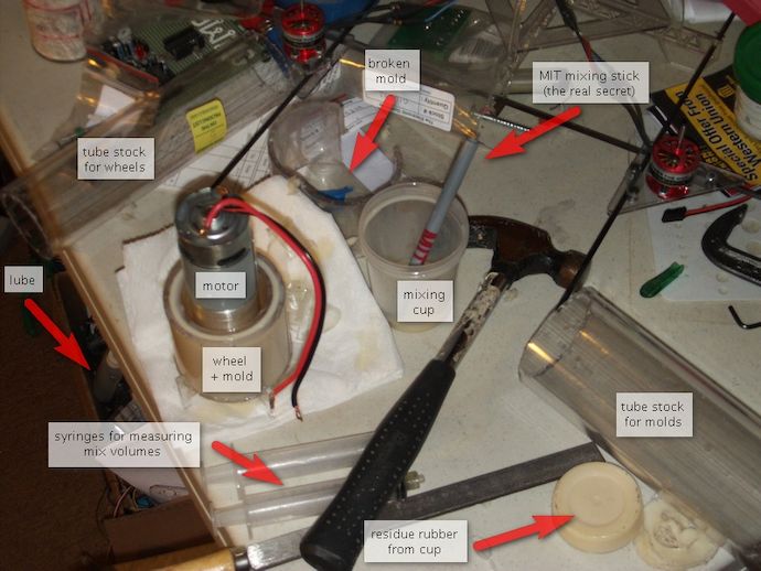 The resulting wheel and tire assembly were extremely sticky. After the wheel was mounted to the gearmotor, each of which is about a pound, it was found that the assembly could stick to vertical painted drywall indefinitely, and even upside-down to the ceiling. The robot, with clean wheels, can push more than 2 to 3 times its weight, depending on the condition of the wheels, alignment, etc. In fact, if the robot were to drive into a wall from a standstill, it can actually pop apart all of its plastic parts at the tab-and-slot joints, and essentially disintegrate. That is why it does not use any glue or plastic weld cement—if the structure can not relieve stress by popping apart at Lego-like joints, then it will crack and cleave.